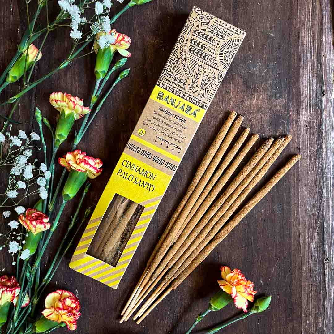 Naturalne, botaniczne indyjskie kadzidełka zapachowe Palo Santo i Cynamon.